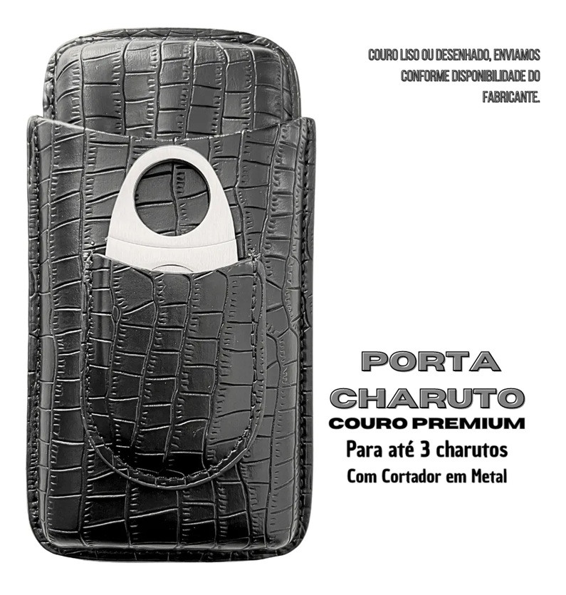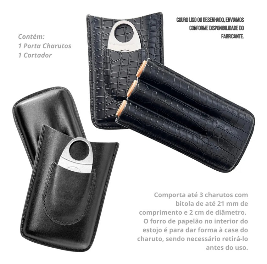 Porta Charutos Couro P/3 Charutos Com Cortador Metal Preto